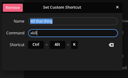 Is there some other command I should use instead of xkill? And regarding keyboard shortcuts, I've tried to create shortcuts for various things and I've yet to have a successful custom keyboard shortcut....so not sure what's up with that.