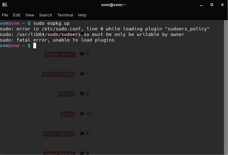 Try to see if you can delete this file rm /etc/sudo.conf